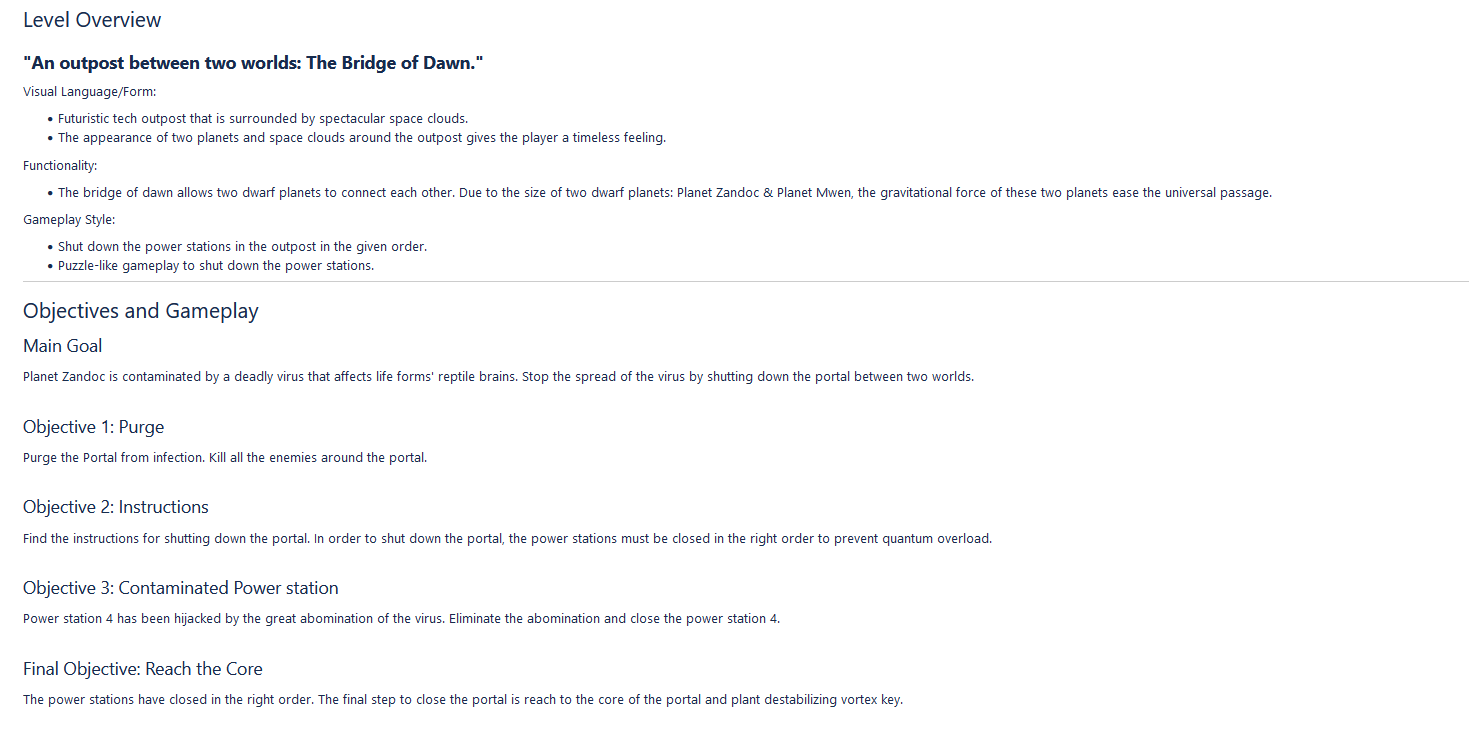 I was in charge of managing the production of the game. I created and maintained a comprehensive wiki for documentation using Confluence.